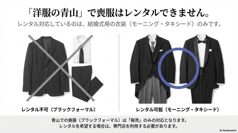 レンタルはできません。青山のレンタルは結婚式用のモーニングコート等の慶事用衣装に限定されています。喪服は販売のみで、即日購入+最短15分のお直しは可能です。