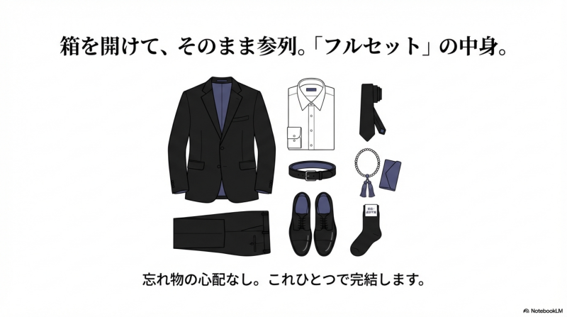 すでに数珠や靴を持っている方は基本セットで十分です。初めて葬儀に参列する方や小物を何も持っていない方はフルセットを選べば、箱を開けてそのまま着用するだけでマナーに沿った装いで参列できます。
