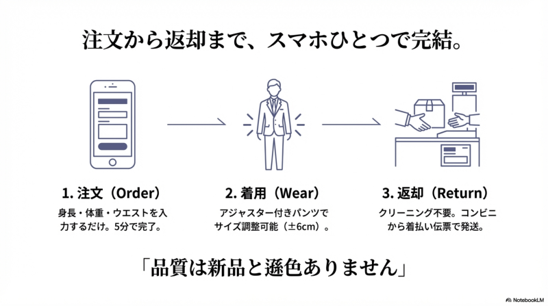 品質はクリーニング済みで臭いもなく清潔な状態です。礼服の裏地もしっかりしており、見た目では新品と遜色ありません。パンツはアジャスター付きで裾上げ不要のフリー丈仕様になっているサービスが多く、届いてすぐ着用できます。