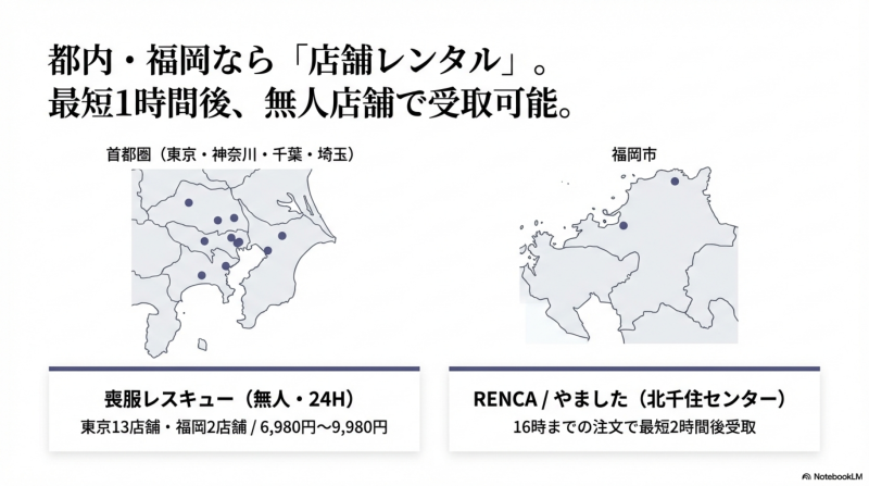 紳士服チェーンでの即日購入(洋服の青山なら最短15分でお直し完了)が全国で対応可能です。東京都内・福岡であれば、喪服レスキュー(計15店舗・最短1時間後から利用可能)も選択肢になります。