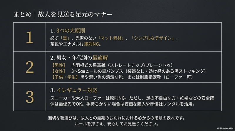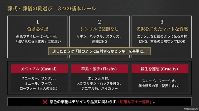 葬儀の靴選びには「黒・光沢なし・シンプルなデザイン」という3つの絶対的なルールがあります。この原則さえ押さえておけば、どんな状況でも迷うことはありません。