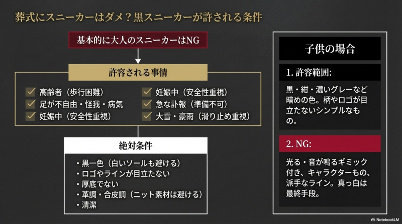 「葬式に黒いスニーカーなら大丈夫?」という疑問は非常に多くの方が持っています。結論から言うと、スニーカーは基本的にNGです。ただし、特別な事情がある場合に限り、例外的に許容されることがあります。
