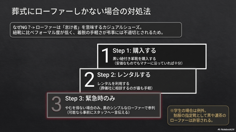 3番目の選択肢を取る場合は、黒で装飾がなく、光沢の少ないローファーを選び、可能であれば事前にご遺族や葬儀社スタッフに一言伝えると丁寧です。