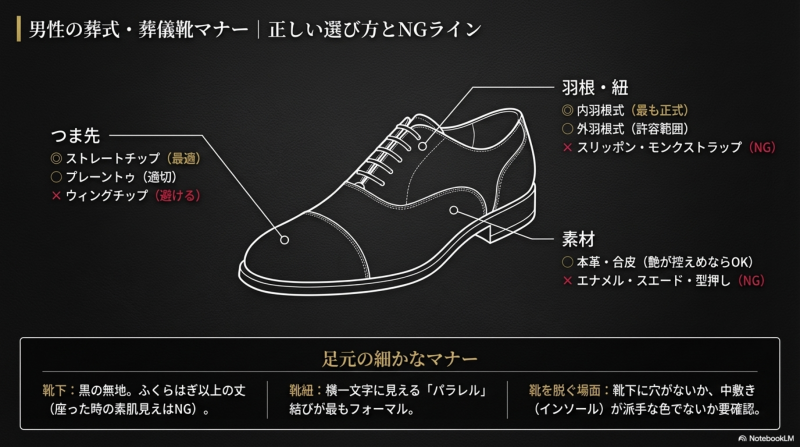 男性が葬儀に参列する場合、足元のマナーは特に重要視されます。「黒色」「紐付き(レースアップ)」「革靴」が大原則です。