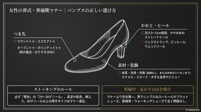 妊娠中や足が不自由な方はフラットシューズで問題ありません。健康な方でも黒でシンプルなローヒール(1〜3cm)パンプスであれば許容されます。3〜5cmがよりフォーマルとされていますが、安全に歩ける靴を優先してください。