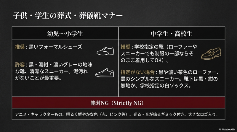 子供が葬儀に参列する場合、大人ほど厳格なマナーは求められません。成長期ですぐにサイズが変わることもあり、手持ちの靴の中からできるだけ場に適したものを選べば十分です。