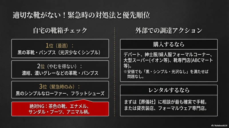 急な訃報で適切な靴がないという状況は誰にでも起こり得ます。慌てて間違った選択をする前に、冷静に対応方法を確認しましょう