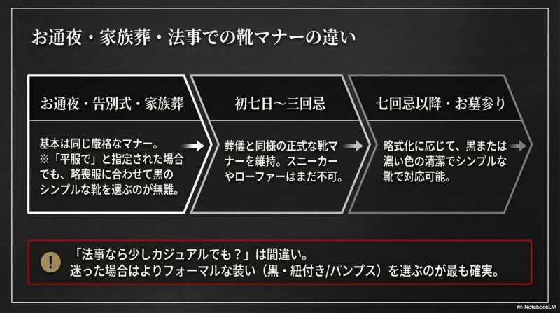 • 七回忌以降:略式化に応じて黒または濃い色のシンプルな靴で対応可