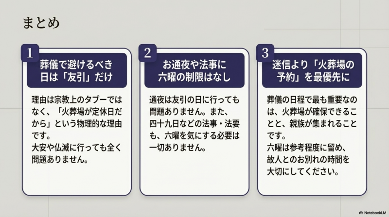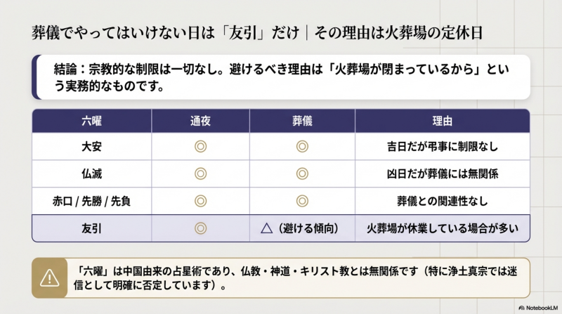 友引に火葬場が休業していれば実施できませんが、大安・仏滅などには制限ありません。火葬場の営業日確認が最優先です。