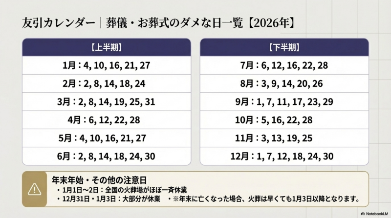 2026年の友引日程を月別にまとめました。葬儀の日程調整にご活用ください。