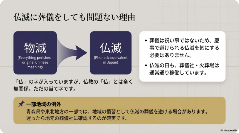 - 東北地方:友引に加え、仏滅も避ける地域がある(青森県の一部)