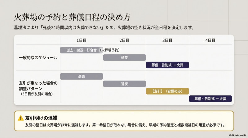 - 翌日の混雑:友引明けは火葬が集中し、予約が取りにくくなる