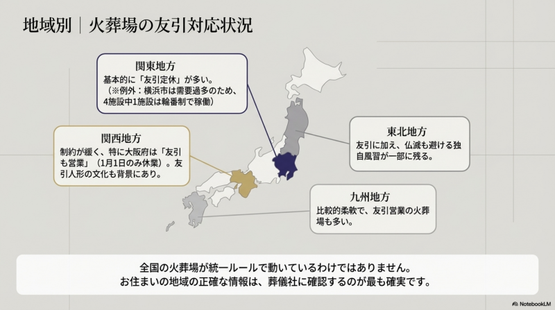 - 中国・四国地方:友引定休が一般的だが、地域差が大きい